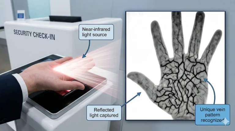 Palm vein scanning uses near-infrared light to read the unique vein patterns inside your palm. The sensor projects infrared light through your skin, and your veins absorb this light differently than surrounding tissue, creating a unique vascular map that’s matched against stored profiles. Because it reads internal structure beneath the skin’s surface rather than external features, it remains accurate regardless of what’s happening to your hands on the outside.